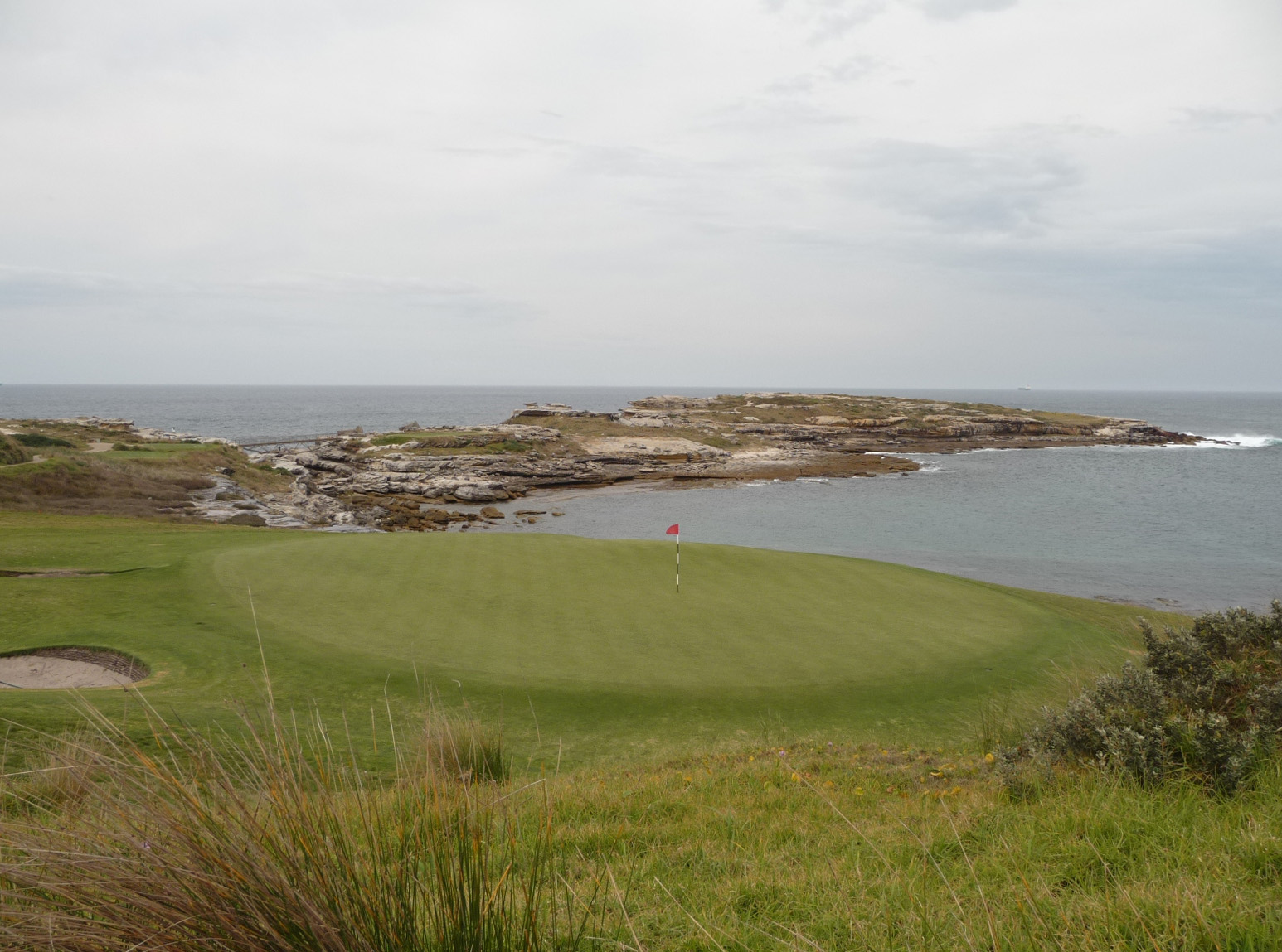 Il s’avère que pendant les 8 kms de côtes sauvages plutôt escarpées qui suivent, à 5 mètres côté terre c’est blindé de types en tenue avec clubs et caddies, dans leur petite voiture à aller d’espaces gazonnées en espaces très gazonnées !!! Et moi au milieu de tout ça, je croise un type (charmant au passage) qui me demande si je me suis perdue tout en cherchant sa balle dans les fourrés. Non je ne me suis pas perdue… pourquoi je n’ai pas le droit d’être là ? En fait si mais il faut faire attention aux balles… Tu m’étonnes John ! Vu jusqu’où ils doivent envoyer leur balle, la force alliée à la vitesse doit bien te sonner !!! Alors je fais attention !